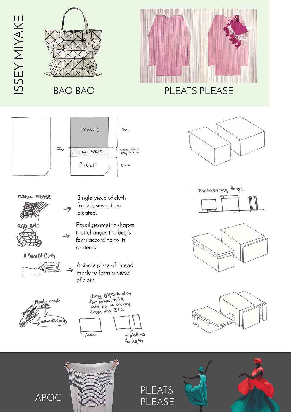 Miyake uses pleats, folds, geometry and volume to manipulate light and shadow, creating visual complexity in an otherwise plain object. All these techniques create depth from what was two-dimensional, and this is what makes Issey Miyake’s designs iconic. In Gaps, this concept is explored through subtractive transformation, the splitting up of planes and the creation of implied volumes. The ‘gaps’ formed through this become the windows that show depth beyond the planes through their transparency.