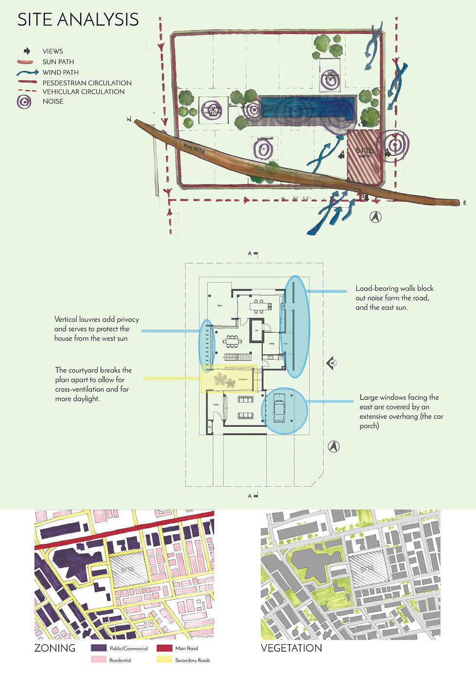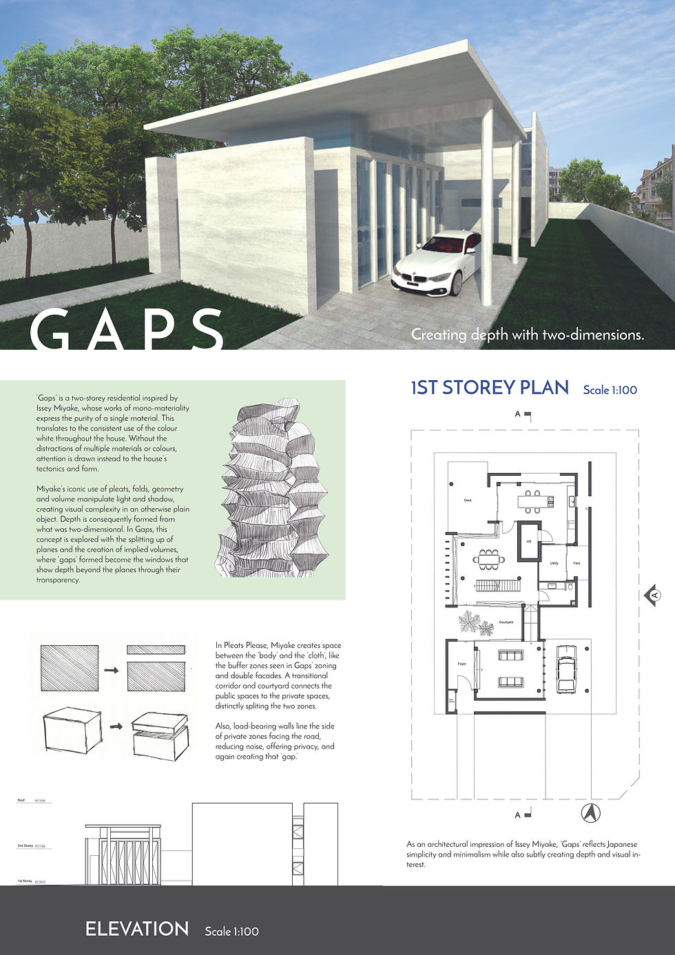 ‘Gaps’ is a two-storey residential conceptualized using the design philosophies of Issey Miyake. The Japanese fashion designer is well-known for creating works of mono-materiality, expressing the simplicity and purity of the material/textile itself. This idea is seen throughout the house, from the consistent use of white walls to white Bianco Carrara marble flooring. Without the distractions of multiple materials or colours, attention is drawn instead to the house’s tectonics and form.