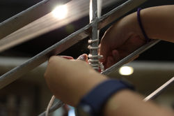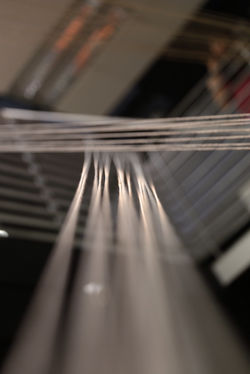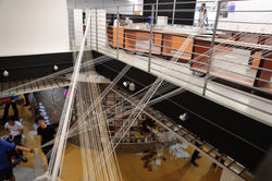 Strings, representing the fundamentals of fashion design, are simply tied across the atrium and do not touch or intersect. Yet, they weave and interact to form visual interest and complexity as a whole. What they also form are different spatial experiences when viewed from different perspectives, like a poetic journey symbolic of movement, which Miyake constantly explores in the design of his clothes.